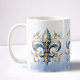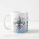 Escolha de estilos de caneca, incluindo vidro. Cor de dentro personalizável para outros estilos. Fleur de Lis na nuvem azul.