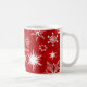 Flocos de neve brancos e vermelhos sobre fundo vermelho em uma caneca de café para personalizar com um nome. O nome será um pouco fora do centro enquanto eu o coloquei onde eu ajustado. Uma boa ideia para uma capa de mesa de férias seria ter canecas personalizadas como lugares sentados, e então elas podem servir como presentes para os convidados.