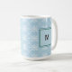 Aproveite suas bebidas quentes favoritas nesta temporada de festas com alguma mágica de inverno extra, com esta caneca festiva com padrão. A caneca é enfeitada com um padrão de flocos de neve, sobre um atraente fundo azul de pó claro. Personalize a caneca com uma inicial, que formará um monograma elegante de um lado da caneca, como um toque de acabamento individual. Um presente de Natal ideal para a cozinha e a casa.