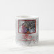 Mantenha suas memórias com estas canecas personalizadas da FOTO. Quadro vermelho do brilho do falso, com neve, fundo dos flocos de neve cores brancas e cinzentas/de prata. Feliz Natal & feliz ano novo com nomes de membros da família. Fácil editar. PRESENTE & lembrança perfeitos!