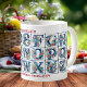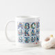 Mug apresentando azulejos com flores no estilo mediterrânico. Legal para crianças que estão aprendendo o alfabeto ou para jardineiros adultos e amantes de flores.