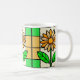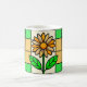uma janela de vidro manchado ilustração de uma margarida amarela e branca com folhas verdes.