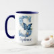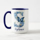 Uma caneca de café personalizada em tons de Azul com borboleta coordenada, apresentando o monograma da letra "A". Personalize facilmente com seu nome ou crie um presente único para seus entes queridos. Espaço suficiente para adicionar uma citação ou mensagem adicional ou até mesmo um fundo. Esta caneca também vem em diferentes estilos e combinações de cores. Navegue pela coleção para ver exemplos deste tipo de fonte nos diferentes estilos e tamanhos de xícara.