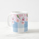 Uma caneca cor-de-água rosa e azul-esmerilada, impressa com grandes cheques azuis e brancos pintados e uma lavagem colorida azul e mauve, aparada com uma grande banda de orquídeas-mariposas.