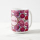Rosas vermelhas, colônias cor-de-rosa e lilases roxas em um fundo branco criam uma linda caneca com um olhar antigo. Um crachá redondo com a borda e o centro em cores complementares tem espaço para o seu nome e monograma.