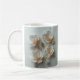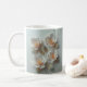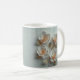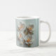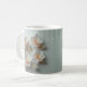 Flores de pêssego brancas, sonhadoras e elegantes, em um fundo verde sábio. As flores parecem feitas de seda.