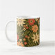Padrão floral retrô com flores ousadas e estilizadas sobre fundo verde-oliva escuro. O padrão é exuberante e abundante, com as flores aparentando flutuar entre a folhagem densa. O contraste entre as flores em tons quentes e o fundo verde escuro cria um efeito visual impressionante.