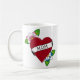 Personalize mamãe tatuando caneca de café com flores rosa e azuis, coração e fita com a palavra MOM no centro, tudo no estilo clássico de tatuagem. Você pode mudar o texto para qualquer mãe ou um nome na caneca. Uma caneca de café excelente para dar como presente dia de as mães para a mãe a sua vida.