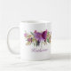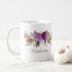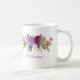 Esta caneca na moda apresenta flores roxas e douradas de moda e roxas e é personalizada com seu nome em uma fonte de script.