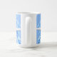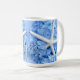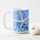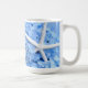 Caneca floral de café com flores azuis-claras de hydrangea e estrelas-do-mar brancas. O design é um efeito espelho que aparece em ambos os lados da caneca ou escolha o viagem.