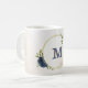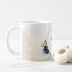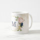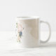 Linda caneca de café com flores rosa naval e folhas verdes.