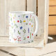 Esta caneca é projetada com um padrão aquoso simples e moderno de flores silvestres e borboletas. As borboletas são azuis, vermelhas e laranja. As flores e folhas são verdes, azuis vermelhos e amarelas.