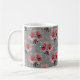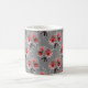 Flores vermelhas em uma cinza de fundo com bolinhas brancas.