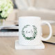 A caneca personalizada apresenta uma coroa botânica verde e branca de cor d'água com seu nome ou dentro inicial inscrito em um script de caligrafia manuscrita.