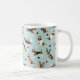Gaivotas bonitas vestidas em roupas festivas de férias, chapéus de Santa e blusas de argila com Enfeites de natal dispersos em fundo azul.