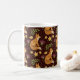 A charming pattern of seated orange foxes surrounded by yellow and purple flowers, green leaves, and dotted accents on a rich burgundy background.