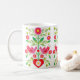 Imagens estilizadas, de Mod e Folksy numa caneca. Comemorar bebidas diárias para tomar café, chá, cacau, bebês, vinho ou sopa. As aves folclinosas são unidas por margaridas, folhagem e corações em uma árvore decorativa para um bonito olhar folclórico sobre fundo branco de neve.
