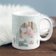 Calma com esta doce e festiva caneca de férias com vibrações acolhedoras e cheias! Design apresenta duas fotos em um layout arquitetado, aninhado em meio a uma cena de uma vila de inverno de neve com casas, torres e árvores. Termine a design adicionando o ano à frente das casas de cada lado.