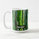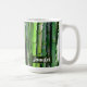 Uma caneca com um tema asiático. Uma fotografia de uma fileira de caules verdes e amarelados de bambu.