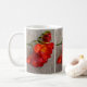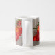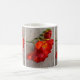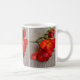 Lindas flores laranja/vermelha Freesia sobre fundo de madeira. Esta foto é repetida três vezes ao redor da caneca para obter um design de visão em cada ângulo.