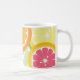 Uma gama colorida de frutas de citros, incluindo laranja, limão, limão e toranja numa caneca.