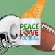 Futebol do Peace Love. Um presente de Natal bonito para um jogador de futebol ou fã. Este design desportivo legal é verde, vermelho e azul com a bola no centro.