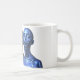 Three hyper-realistic chrome and blue female android heads with closed eyes, on a glossy white mug.