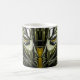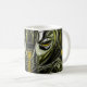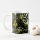 Stylized metallic side-profile face in deep green, yellow-gold and black on a glossy coffee mug.