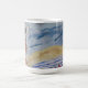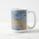 Uma gaivota faminta na praia vê o piquenique na toalha de praia listrada. É um dia ensolarado quente à beira-mar e as ondas azuis subem na areia. As aquarelas moles criam uma encantadora cena de praia de verão.