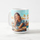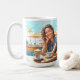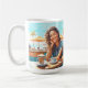 Garota sorridente com um café relaxante, cappuccino. Imagem artística para uma pausa relaxante e divertida, com um fundo marinho ensolarado.