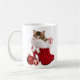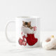 O racum bonito de maine do gato malhado em botas legal do Natal, com bastões de doces e ornements do Natal, projetou pelo artista Maryline Cazenave.