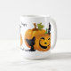 Dois gatinhos negros bonitos com um Jack O Lantern, e dizendo que Feliz Meow'lloween - que é personalizável para o que você sempre diz - Trick ou Treat - Perfeito para bebendo seu cacau quente numa noite fria de Halloween