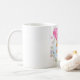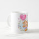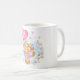 Gato bonito numa saia com um balão cor-de-rosa com flores ao fundo