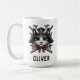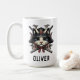 Caneca cativante com a face de um gato samurai sábio usando um capacete samurai autêntico, com espadas japonesas elegantes adornando o fundo. Este design único mistura o charme felino com o espírito guerreiro, tornando-o um item indispensável para aventureiros. Abrace o encanto do Japão antigo com esta caneca exclusiva do Gato Samurai.