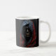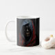 A imagem retrata um retrato aproximado de uma pessoa que se assemelha a um fantasma ou zumbi com uma face escura, quase esquelética, coberta por uma rede de finas linhas de ouro. Seus olhos são largos e intensos, encarando diretamente o espectador. A figura é envolta num manto de capuz feito de uma bandeira americana envelhecida e apunhalada, com as listras vermelhas e brancas visíveis ao redor do pescoço e ombros. Imagem: um posto apocalíptico ou distopiano.