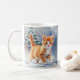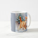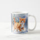 Uma caneca de Natal muito bonito, com uma ilustração em estilo aquoso de um adorável gatinho gengibre na neve. A saudação "Feliz Natal" está no topo, na tipografia festiva da escrita. Ideal para amantes de gatos, esta caneca fofa pode ser personalizada com seu(s) nome(s) ou outro texto.