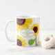 Caneca de café para amantes de girassóis com nossas ilustrações em aquarela de flores amarelas exuberantes, esta caneca é um presente perfeito para qualquer pessoa. Adicione um nome, mensagem e aniversário para personalizar.