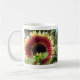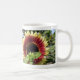 Um girassol bicolor vermelho (helianthus annuus) na flor completa com um botão do girassol. Esta variedade, Razzmatazz, é uma mistura dos vermelhos, de bicolors vermelhos, e de brancos.