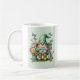 Um gnomo de jardim bonito sentado em um banco com flores e borboletas segurando um sinal que diz .. Feliz Dia das Mães