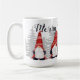 Esta linda caneca de café de férias mostra quatro gnomos vestindo chapéus de justiça vermelhos em frente aos pinheiros. Acima dos gnomos da escrita moderna lê-se "Feliz Natal". Projetada por Susan Coffey.