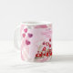 Esta linda caneca de café Dia de os namorados personalizada apresenta um design cor-de-água rosa e vermelha. Uma ilustração de um pequeno trem Namorados com gnomos é ilustrada no fundo. Vários corações destacam a imagem. A borda apresenta um padrão de xadrez rosa saudável.