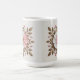 This mug features a decorative floral mandala design with a white background. The centerpiece features a large white and pink flower with gold leaves and gold centers. The leaves are in a symmetrical pattern radiating outward. Small pink flower buds are throughout the design, connected by thin tan stems. The leaves are detailed with visible veins and a glossy texture. The mug is a white classic mug. The mug is a fifteen ounce mug. The mug is microwave and dishwasher safe.