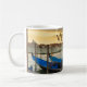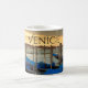 Fotografia bonito do por do sol de Veneza Italia com as gôndola azuis no primeiro plano. Reflexão dourada do céu na água.