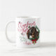 Café de Natal Mug- Retrato Adorável de um Dobra Nubiana com verde de Natal, sagrado e bagas, um arco vermelho e uma condecoração - com texto de caligrafia ornamentado que diz: Desejos de Natal e Beijos Bebês - Preencha com algo maravilhoso para o presente de Natal de excelente Goat Lover! - Perfeito para o amante da cabra na família - eles não ficarão surpresos em ver esta única cabra de Natal Original em sua manhã de Natal na Árvore. Um original ©goatLady GetYerGoat™.