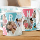 Caneca de café de mel, personalizada com 5 das suas fotos favoritas e impressa com um nome de 4 letras, como GRAN. A design apresenta uma colagem de fotos em favos de mel em uma bonito paleta colorida de rosa azul de verão e alabastro, com uma abelha fofinha. Se quiser alterar as cores, clique em "personalizar mais" e clique em cada hexágono que deseja alterar.