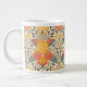 Esta caneca gigante apresenta flores e folhas em tons de amarelo, laranja e cinza azul sobre fundo creme.