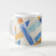 Caneca com arte em aquarela com formas geométricas nas cores base, laranja e azul, pintadas de maneira intuitiva e coordenada pra deixar espaços harmônicos entre os formatos, tornando a obra única e agradável aos olhos.
