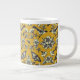 Esta caneca gigante apresenta pássaros, flores, abelhas e borboletas em azul-marinho e creme em fundo amarelo-mostarda.