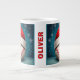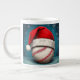 Beisebol Red Santa Hat, nome da caneca gigante de café de Natal. O design tem duas bolas de beisebol com um chapéu vermelho de Papai Noel num fundo de inverno com flocos de neve brancos. Personalize com seu nome. Excelente para alguém que ama esportes.