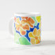 Uma Mug colorida e na moda, de tamanho Jumbo, com um design 'Nasturtius', em laranja, vermelha, amarela e verde sobre fundo azul, de um design de cor d'água pintado à mão por Judy Adamson. Um pote de chá e várias canecas também estão disponíveis com esse design.